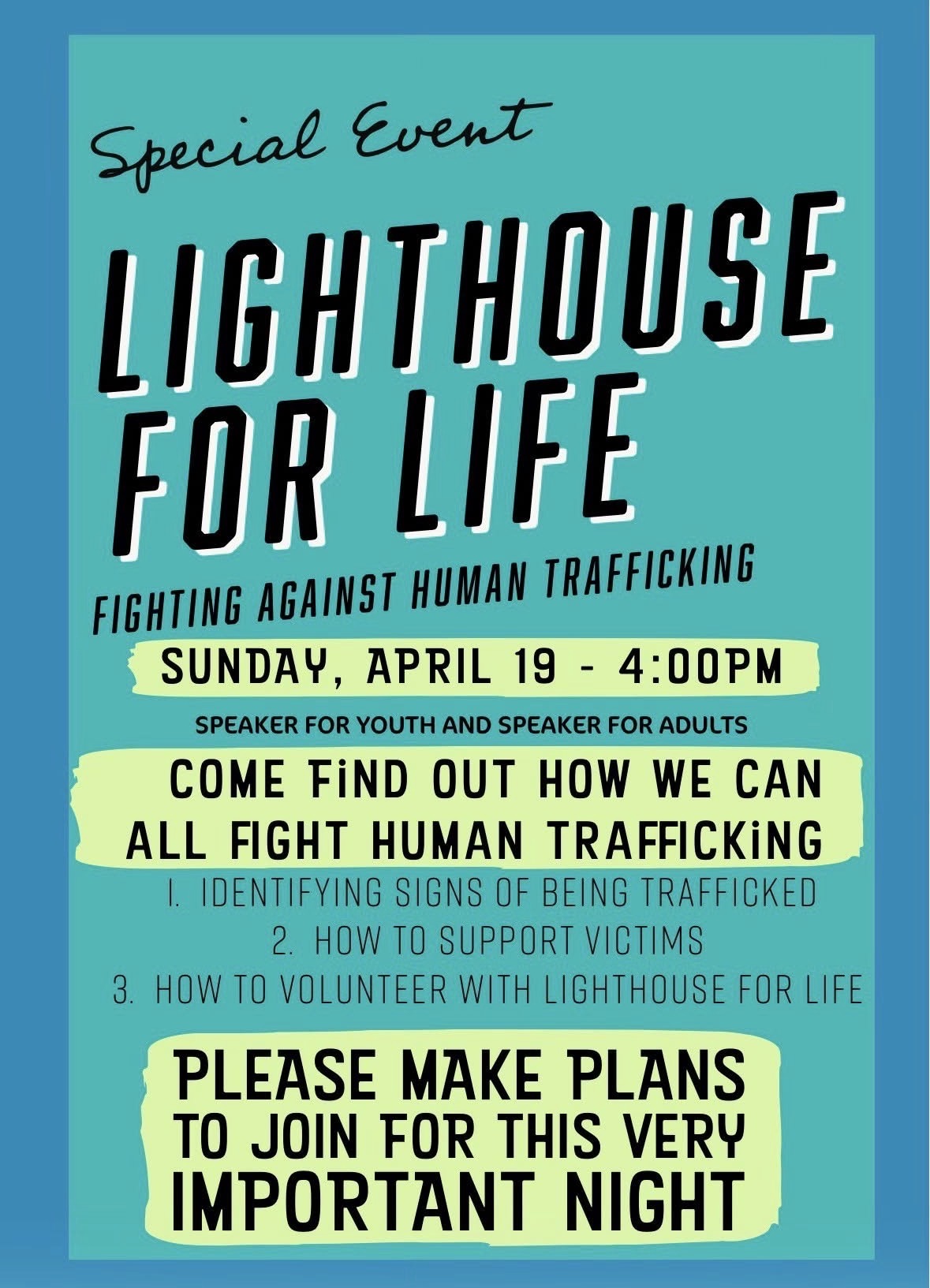 Join us Sunday, April 19, at 4:00 PM for a special event with Lighthouse for Life. Learn how to recognize the signs, support victims, and take action.